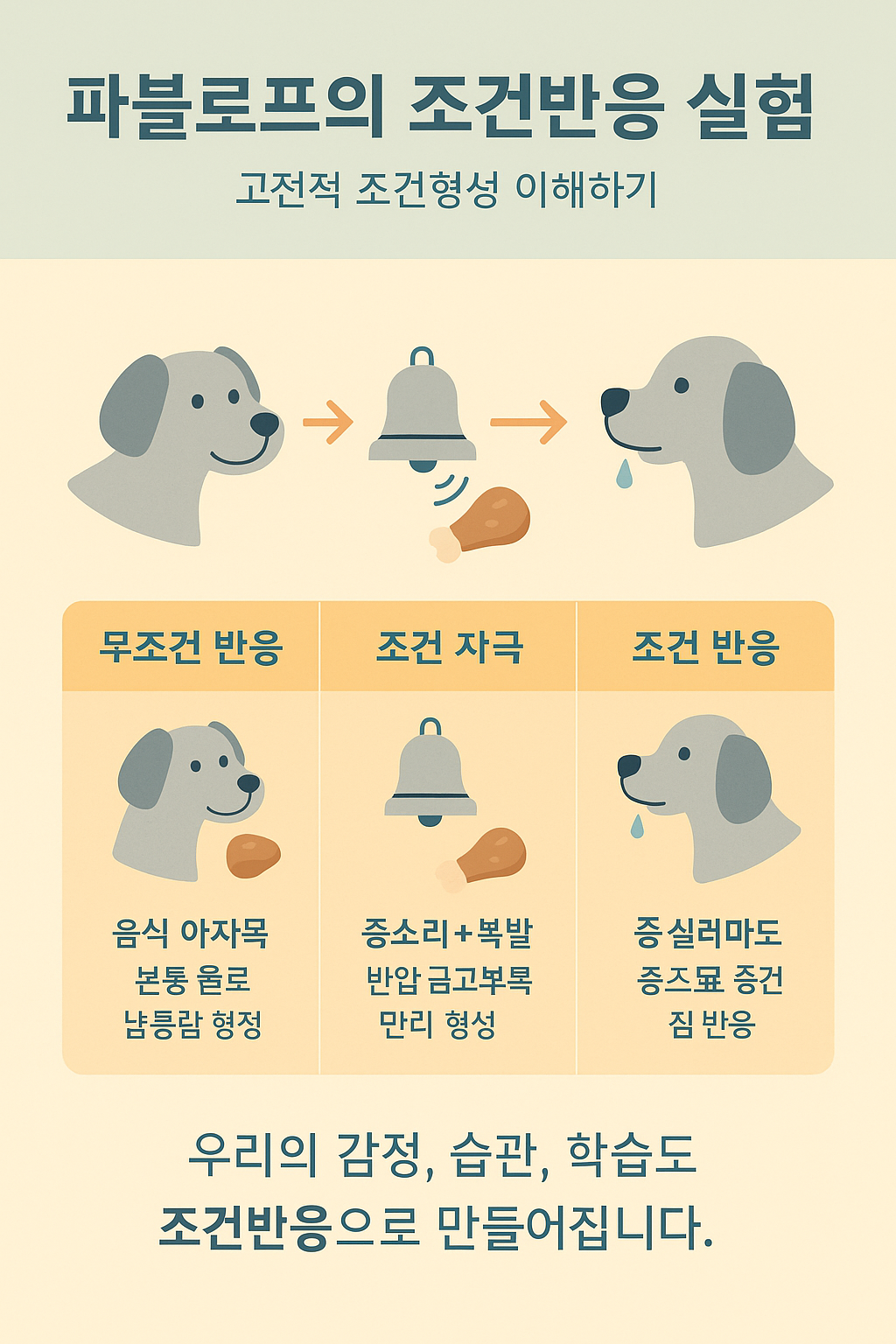 파블로프는 메트로놈이나 종소리와 같은 중립 자극을 음식 제공과 함께 제공하는 일련의 통제 실험을 수행했습니다. 시간이 지남에 따라 개들은 중립적인 소리를 곧 다가올 음식의 도착과 연관시키기 시작했고, 음식이 제공되지 않았을 때에도 소리만 들어도 침을 흘리기 시작했습니다. 이러한 소리에 대한 침 분비 반응은 음식을 보거나 냄새를 맡을 때 침을 흘리는 '무조건 반사'와 구별하기 위해 '조건 반사'라고 불렸습니다.